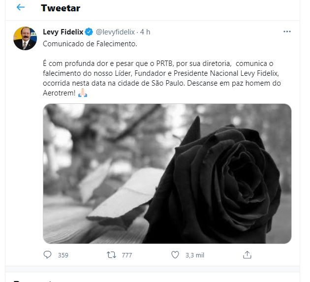 “É com profunda dor e pesar que o PRTB, por sua diretoria, comunica o falecimento do nosso líder, Fundador e Presidente Nacional, Levy Fidelix, ocorrida nesta data na cidade de São Paulo. Descanse em paz homem do Aerotrem!”, diz texto postado no Twitter de Fidelix.