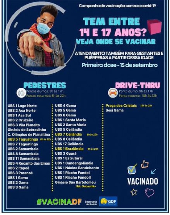Com um carregamento de 77.220 doses de vacinas Pfizer-BioNTech, o Distrito Federal vai poder iniciar, a partir de amanha (15/09), a vacinação de jovens de 14 e 15 anos, ampliando dessa forma o público-alvo a ser imunizado contra a covid-19.
