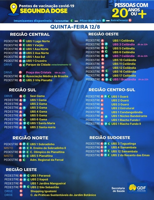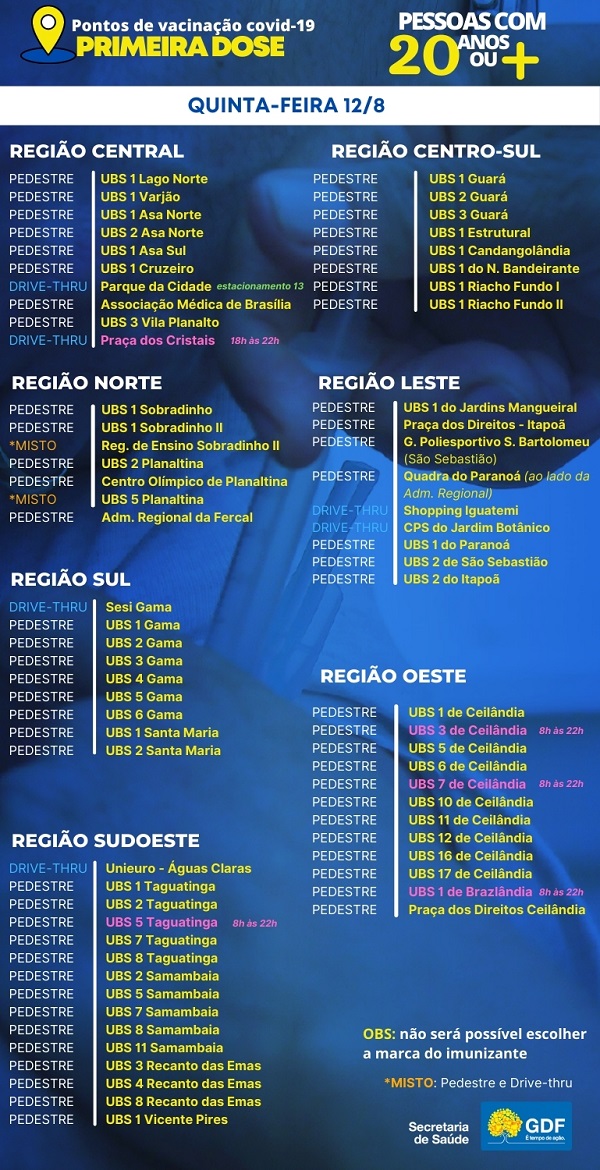 A partir desta quinta-feira (12) começa a vacinação para 300 mil jovens entre 20 e 24 anos, em 70 pontos disponibilizados pela Secretaria de Saúde em todo o Distrito Federal.