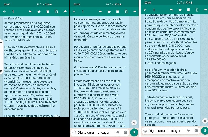 Pelos grupos de whastsapp a grilagem busca também investidores, conforme explicam na mensagem abaixo, veja: