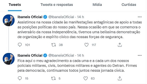 “Assistimos na nossa cidade às manifestações antagônicas de apoio a todas as posições políticas do nosso país. Nessa ocasião em que se comemora o aniversário da nossa Independência, tivemos uma belíssima demonstração de organização e espírito cívico das nossas forças de segurança”.