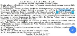 Araújo que é da base do governo e possui uma penca de cargos na máquina pública, é o autor da lei 5.825 de abril de 2017 que dispõe sobre a realização de perícia anual a pontes e viadutos do DF. Na época, a lei foi vetada pelo governador, mas o deputado Joe Vale, presidente da Câmara, derrubou o veto e promulgou a lei.
