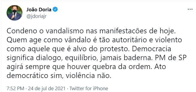 “Condeno o vandalismo nas manifestações de hoje. Quem age como vândalo é tão autoritário e violento como aquele que é alvo do protesto. Democracia significa dialogo, equilíbrio, jamais baderna. PM de SP agirá sempre que houver quebra da ordem. Ato democrático sim, violência não”, escreveu.