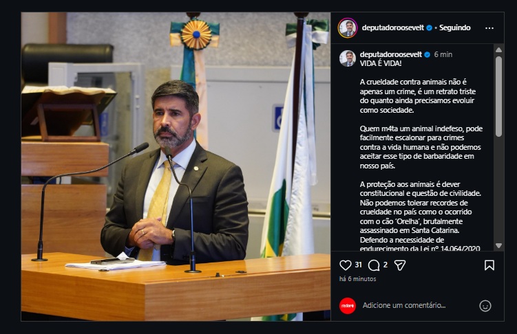 O deputado distrital Roosevelt Vilela (PL-DF) manifestou apoio público à causa animal, defendendo penas mais rigorosas para quem maltrata qualquer espécie e a classificação como crime hediondo para atos extremos de crueldade.
