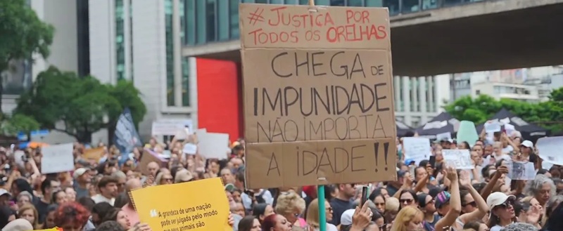 Em frente ao vão livre do MASP, símbolo de lutas coletivas, participantes vestidos de preto carregaram retratos do vira-lata, choraram, gritaram e exibiram cartazes com mensagens como “Justiça por Orelha”, “Quem merecia viver está morto” e “Covardes não são crianças”.