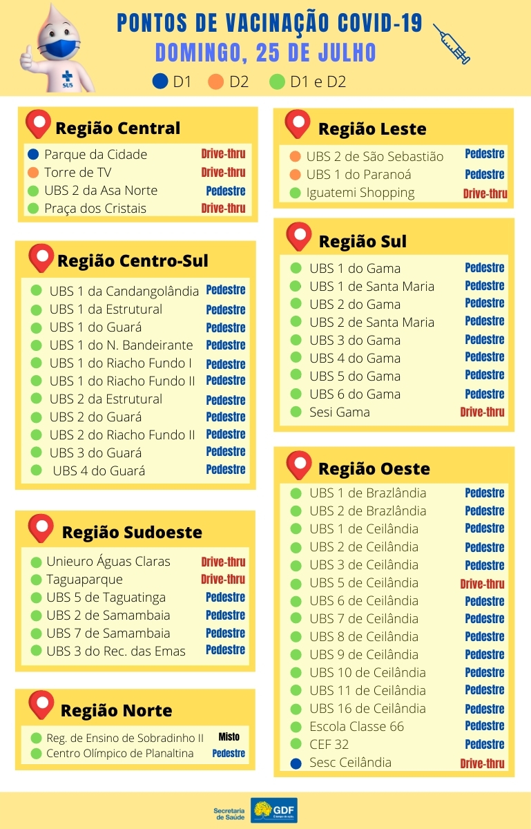 Cerca de 51 pontos de vacinação estarão disponiveis em várias regiões do Distrito Federal como continuidade do mega mutirão de vacinação contra covid neste domingo (25).