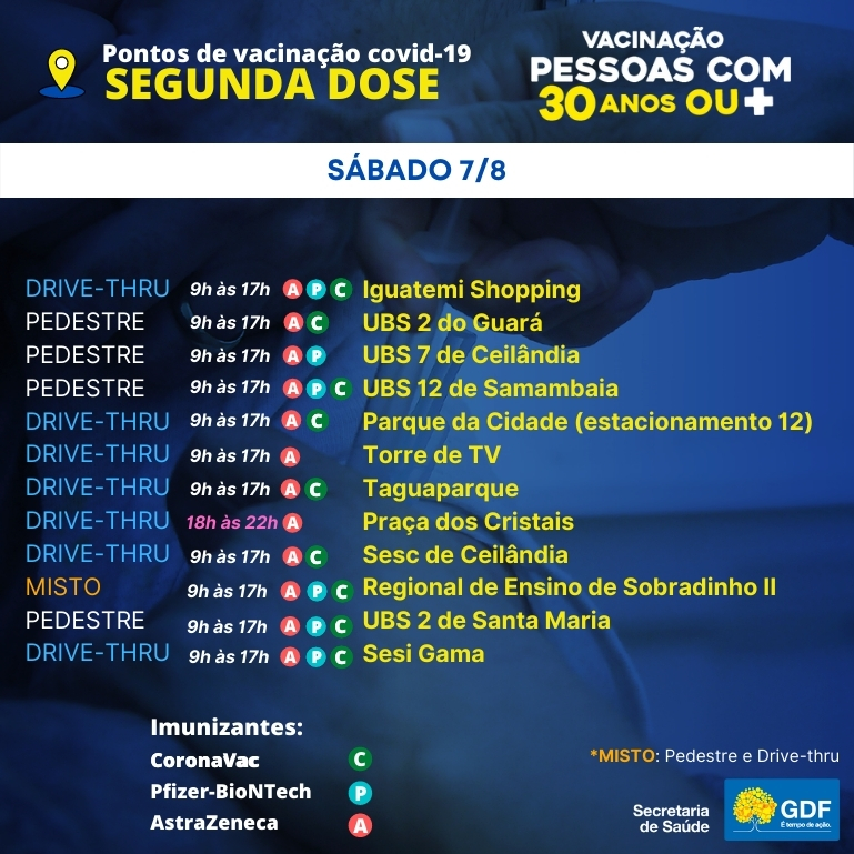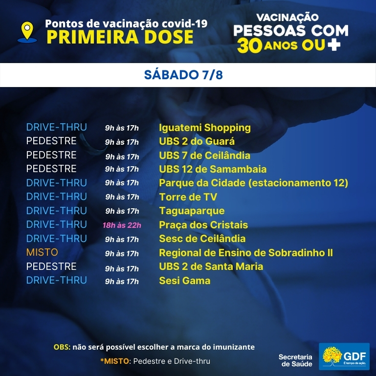 A Secretaria de Saúde do DF  disponibilizou para funcionar  neste sábado (07), 12 pontos de vacinação contra covid, com atendimento para pedestres e na modalidade drive-thru.